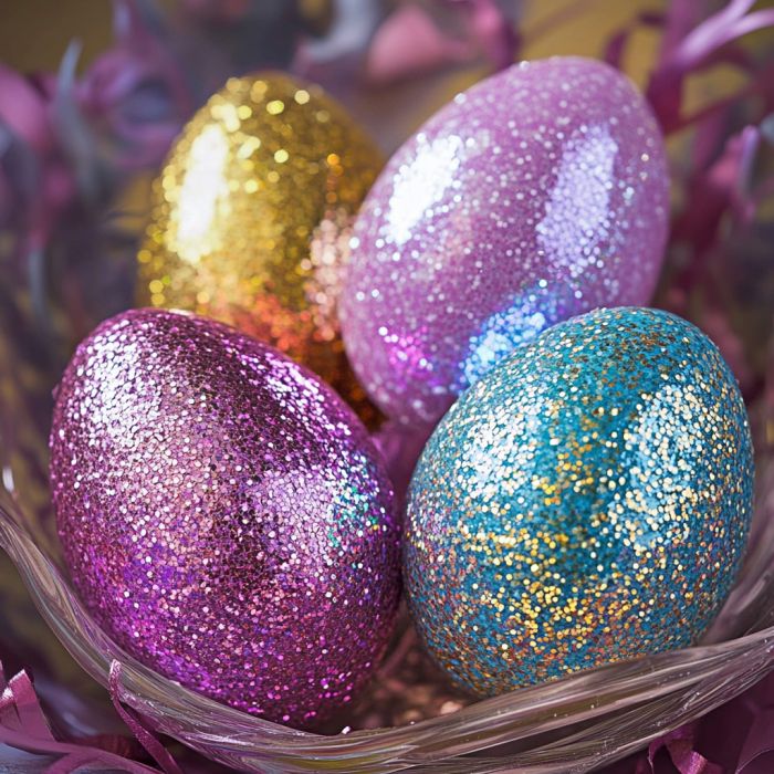 For a touch of sparkle, glittering glamour eggs are the perfect choice. Begin by coating each plastic egg with a layer of decoupage glue. While the glue is still wet, sprinkle fine glitter over the surface, ensuring even coverage. Allow the eggs to dry completely before applying a second layer of glue to seal the glitter in place. These dazzling eggs can be displayed in a decorative bowl or used as part of a festive centerpiece, adding a glamorous touch to your decor.