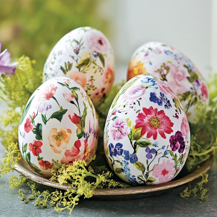 Floral decoupage eggs bring a touch of nature indoors. Begin by cutting out floral patterns from napkins or tissue paper. Apply a thin layer of decoupage glue to a plastic egg and carefully place the floral cutouts onto the surface. Smooth out any wrinkles with a brush and apply another layer of glue over the top to seal the design. Once dry, these floral eggs can be displayed in a decorative dish or used to enhance a floral arrangement, adding a whimsical touch to your decor.