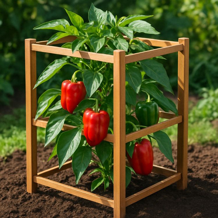 Peppers benefit from a compact cage trellis that supports their bushy growth habit. A simple wire cage or wooden frame keeps the plants upright and prevents branches from breaking. This design also improves air circulation and sunlight exposure, leading to healthier plants and better yields.