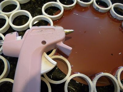 Although she later regretted not painting the circles first, she was able to hide any pipe markings with smart design arrangement before she began hot gluing the circles together in her desired pattern. She then glued a mirror from a local craft store in the pattern's center.