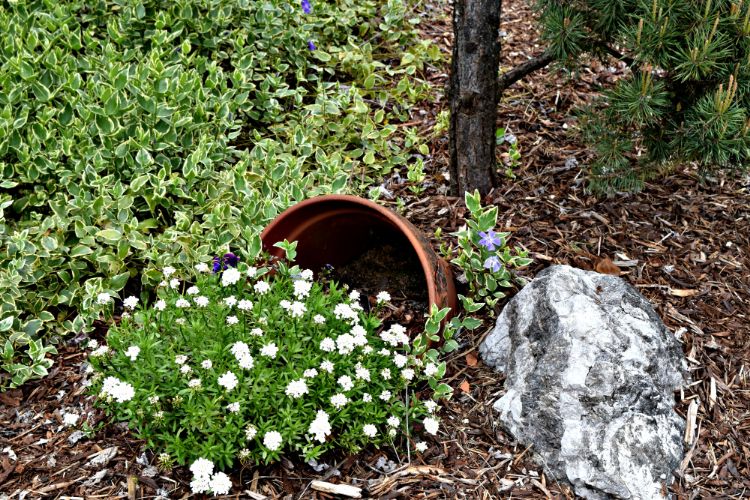 To create your spilled flower pot centerpiece, dig a hole in your desired location. Next, put the flower pot in the hole and fill it in with potting soil and five to six plants.