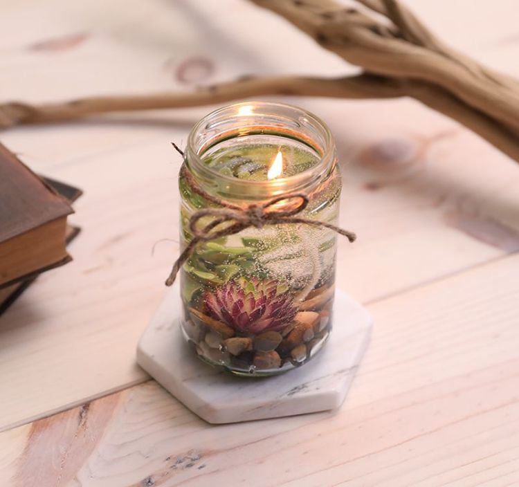 Combine your love for succulents and candles to create a charming terrarium candle. A few faux succulents and a handful of small stones instantly transform a jar into a tiny terrarium. Get the full tutorial here.