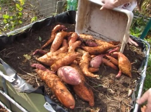 Yield will vary of course, but Five Gallon Ideas produced about 25 pounds (11 kilograms) of sweet potatoes from their 20-gallon (75-liter) bucket; Rob's harvest from a 25-pound (95-liter) bag of soil was 33 pounds (15 kilograms)!