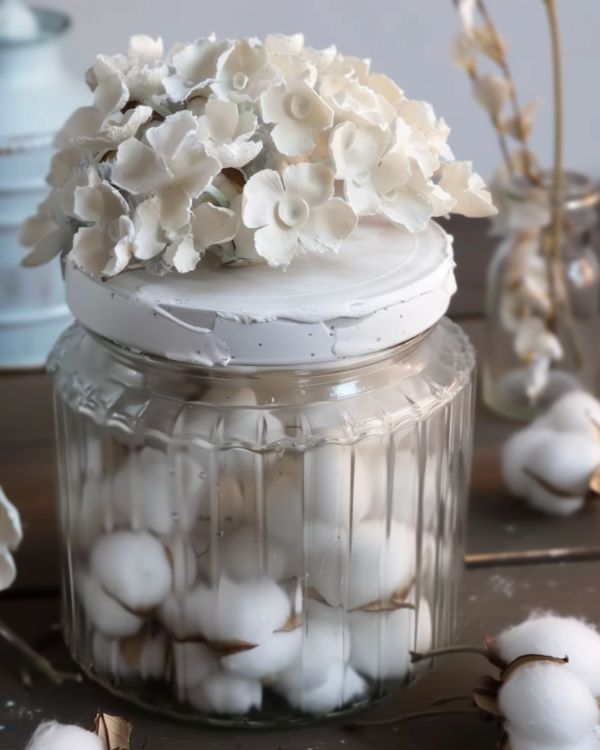 Add a little pop to your bathroom storage solutions by attaching smaller plaster flowers to the lids of glass jars. Fill the jars with cotton balls or other essentials, and pop the cute lid on top. Feeling more decorative? Fill the jars with colored sand, shells or marbles.