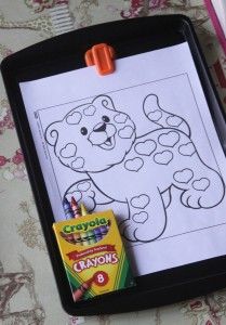 If you have a metal tray, you can create a portable play tray for your kids. Use one magnetic clip to hold their coloring page to the tray in the car while another magnetic clip can keep a small bag of crayons attached to the tray.