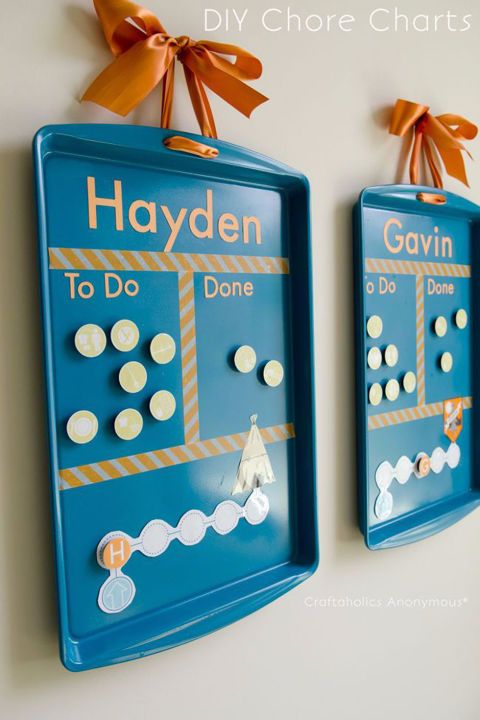 Create individual chore charts for each kid by hanging an old tray on the wall and attaching magnets representing different chores. Every time a kid finishes a chore, that magnet gets moved to the other side of the tray. It's a fun way for them to see how much progress they're making throughout the day.