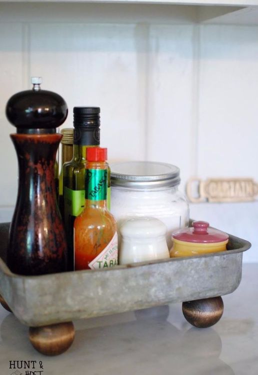 Are your kitchen cabinets a little cluttered? Instead of trying to shove everything haphazardly into a cupboard or a box, put your old food tray to good use as a spice rack. If it still seems to be taking up too much space, add wooden knobs to the bottom to create a footed tray so you can store smaller items underneath the tray.