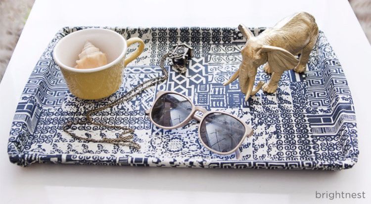 To upcycle an old food tray into a fancy serving tray, add some paint or fabric. This is an extremely simple, cheap way to turn something ordinary into something that looks pretty and expensive.