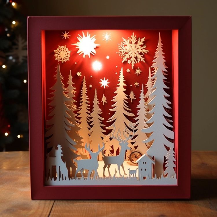 Create an enchanted forest with this Christmas shadow box idea. This one uses paper stock trees. Lights adds that extra glam factor.
