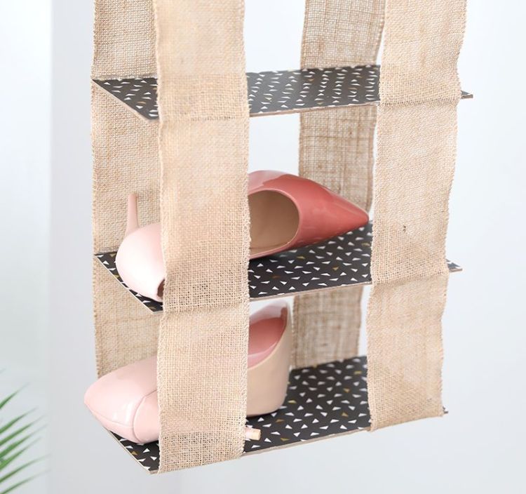 A couple of 12-inch cardboard squares lay the groundwork for a shoe organizer you can hang from the back of a closet door or in an entryway. The cardboard provides the structure, and decorative paper and burlap edging add rustic flair. Get the full tutorial here.