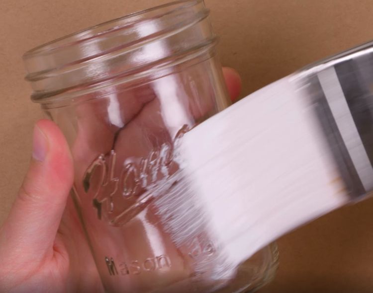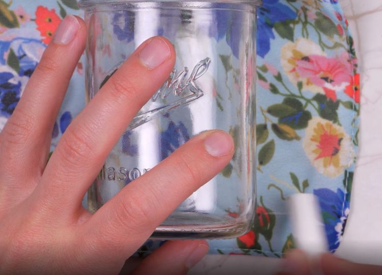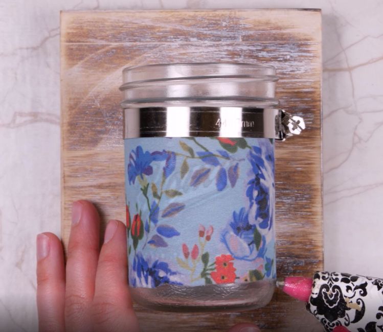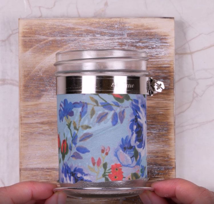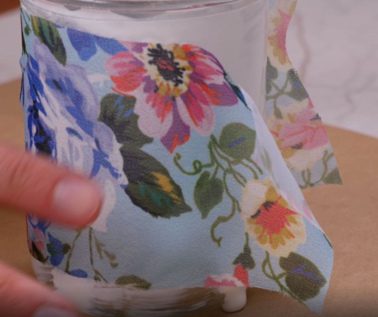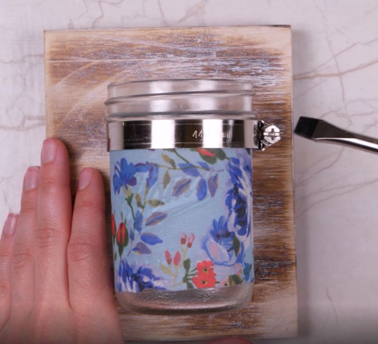 4. Press the fabric onto the outside of the jar, smoothing it out so there are no wrinkles.