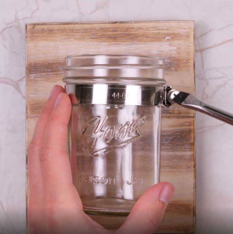 - Mason jar attached to piece of wood with hose clamp