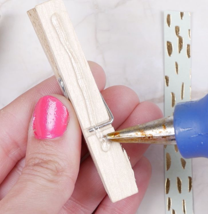 6. Repeat steps 4 and 5 using the other type of decorative paper on the other half of the clothespins.