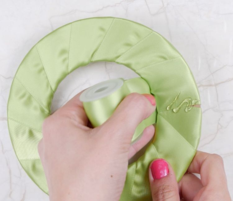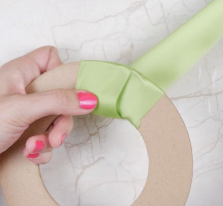 1. Add hot glue to the wreath ring, then press the end of the green ribbon into the glue.