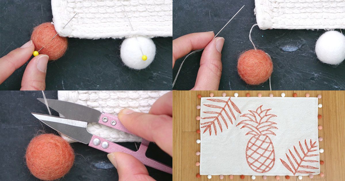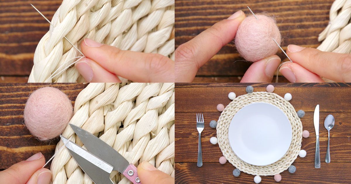 Table setting is becoming a lost art. We live in a time of rushing here and there, where dinner is often be eaten on the couch or gobbled from takeout containers. Give mealtime its importance with fun and creative table settings, starting with your place mats. A simple way to elevate your plain place mats is to add felt ball adornments around the edge.