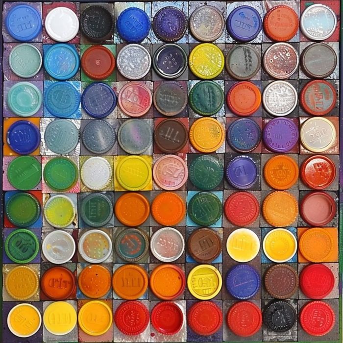Collect different colored bottle caps and use them to create a vibrant mosaic tile. Apply them to a base, like a tabletop or a wooden board, using strong adhesive and then grout between the caps.