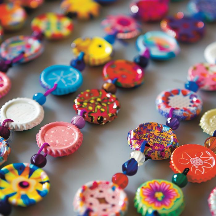 Create fun, funky jewelry by stringing colorful caps together or using single caps as pendants. Decorate with paint, glitter, or other embellishments for added style.