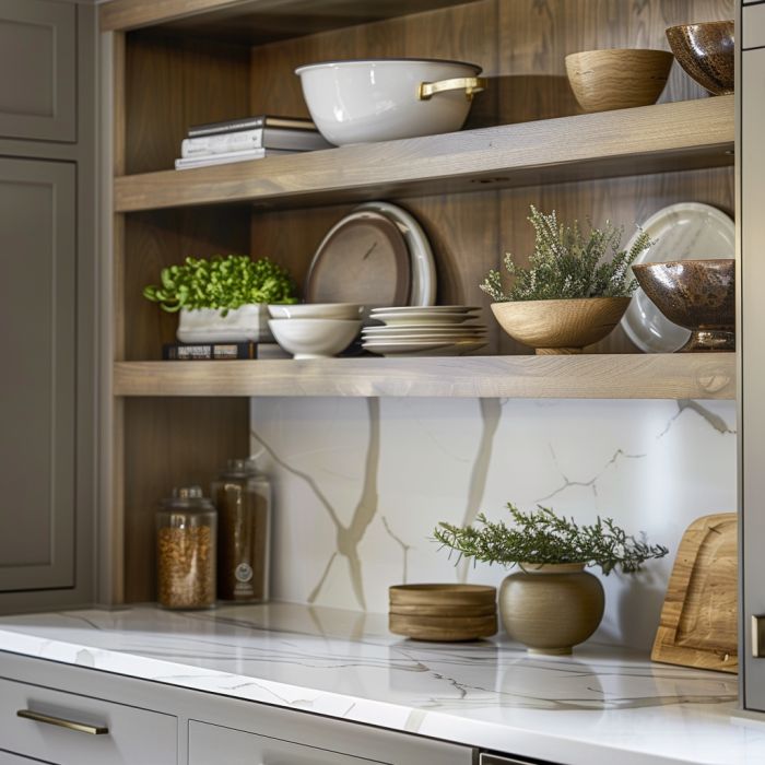 Remove some of the doors to create open shelving. This modern trend allows you to display beautiful dishes, spices, or keepsakes, making your kitchen feel more open and airy.
