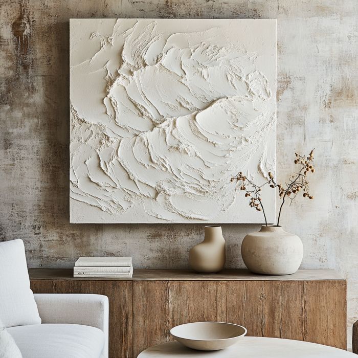 Textured art is having a huge moment online, and old canvases are the perfect base for creating your own. Start by spreading a thin layer of joint compound (also called drywall mud) directly over the old painting. Use a palette knife or even everyday objects like a butter knife or fork to sculpt lines, waves, or swirls into the surface. Let it dry thoroughly before painting it in soothing neutrals—think white, beige, or terracotta—for a minimalist, high-end look. This piece pairs beautifully with modern or Scandinavian decor, especially when hung above a console or bed.