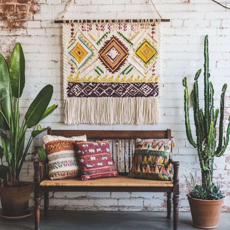 Get boho with it by transforming your canvas into a cozy textile wall hanging. Remove the canvas from its wooden frame and wrap the frame in rope, yarn, or fabric strips. You can also stretch a pretty piece of fabric or a woven rug over the frame and secure it at the back. Add fringe, tassels, or beads for an extra artsy touch. This one’s perfect for bedrooms, reading nooks, or anywhere you want to add some handmade warmth.