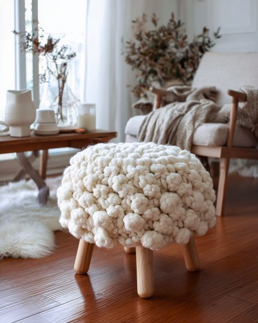 The DIY crochet snow puff footstool is a versatile piece that can complement various interior design styles. It adds a playful, cozy element to a Scandinavian or minimalist living room, acting as a soft accent piece against clean lines and neutral palettes. In a bohemian or eclectic space, it can serve as a quirky focal point, contrasting with bold colors and patterns. Pair it with a cozy throw blanket and some textured pillows for an inviting, layered look.