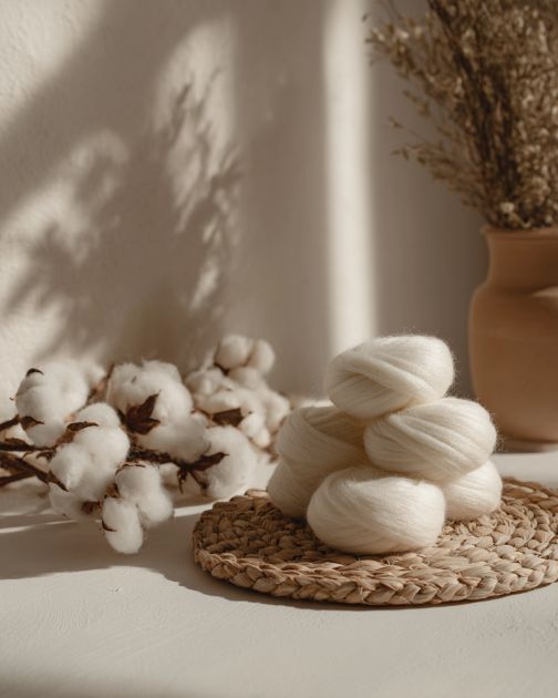 2. Using the strong cotton or nylon thread, stitch through the center of the cotton balls to connect them. Continue adding cotton balls in this manner until you have a long, thick strand of cotton yarn.