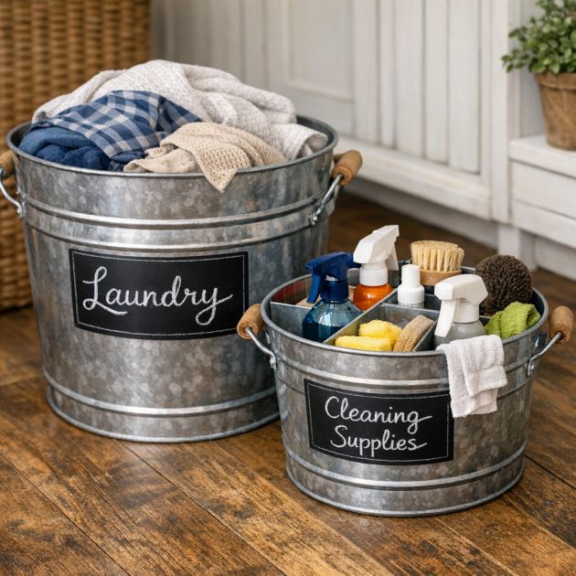Metal buckets can be transformed into charming farmhouse-style laundry and cleaning caddies. Their durability makes them perfect for carrying cleaning supplies or laundry from room to room. You can customize the bucket by painting it with chalkboard paint, allowing you to label the contents with ease.