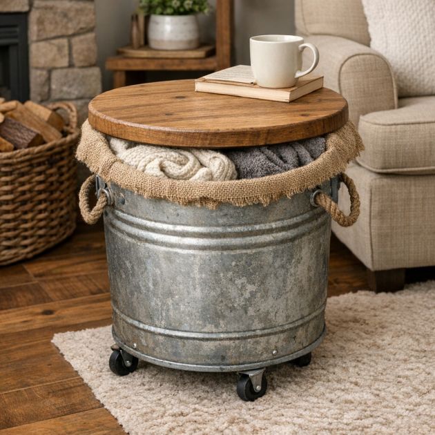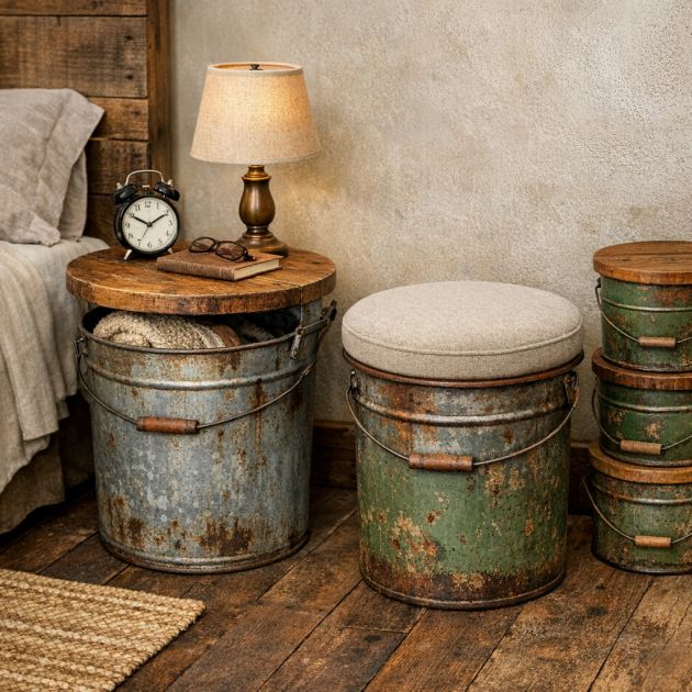 Transforming old metal buckets into functional furniture is a creative way to reuse them. By adding a wooden top, you can turn a bucket into a side table or nightstand. The bucket's interior can be used for storage, making this a practical solution for small spaces.