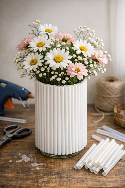 To personalize your DIY fluted vase, consider using straws of different diameters for a varied texture. You can also experiment with metallic or matte spray paints to match your interior design theme. For a more natural look, use bamboo or paper straws. Additionally, try wrapping the straws in decorative paper or fabric before gluing for a patterned effect. This project is versatile and can be tailored to fit any style preference.
