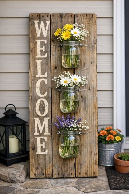 To style this DIY welcome sign, consider placing it against a neutral-colored wall to make the wood and glass stand out. Incorporate additional rustic elements like a vintage doormat or a wrought iron plant stand nearby. You can also enhance the look with fairy lights inside the mason jars for an inviting glow during evening hours. This piece pairs well with other natural materials such as clay pots or woven baskets, adding warmth and texture to your entryway.