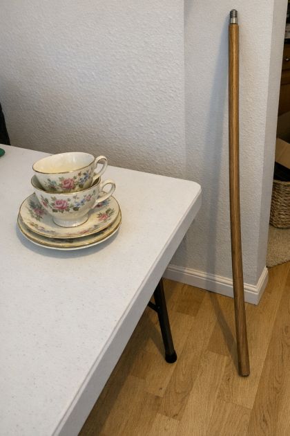 Apply a generous amount of waterproof adhesive to the bottom of the first teacup and press it onto the top of the broom handle, centering it carefully.
