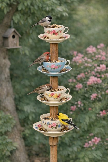 The DIY tall garden bird feeder has become a backyard sensation, inspired by the charming design of vintage floral teacups. This project not only recycles beautiful china but also adds a whimsical touch to your garden, inviting birds to visit and bringing a sense of vintage charm to your outdoor space. It's a creative way to repurpose old teacups and turn them into a functional and aesthetically pleasing garden feature.
