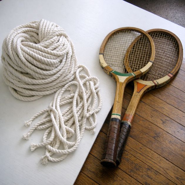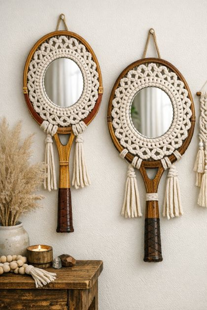 This DIY project cleverly combines vintage aesthetics with modern boho chic by transforming old wooden tennis rackets into a stunning wall mirror. Utilizing the sturdy frame of a vintage tennis racket and crocheting with thick white cotton cord, this project offers a unique way to recycle and breathe new life into forgotten items. It's perfect for those looking to add a personalized touch to their home decor with a piece that is both functional and artistic.