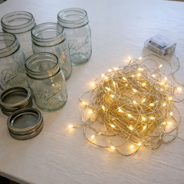 Insert the battery-operated fairy lights into the mason jars, leaving the battery pack outside for easy access.