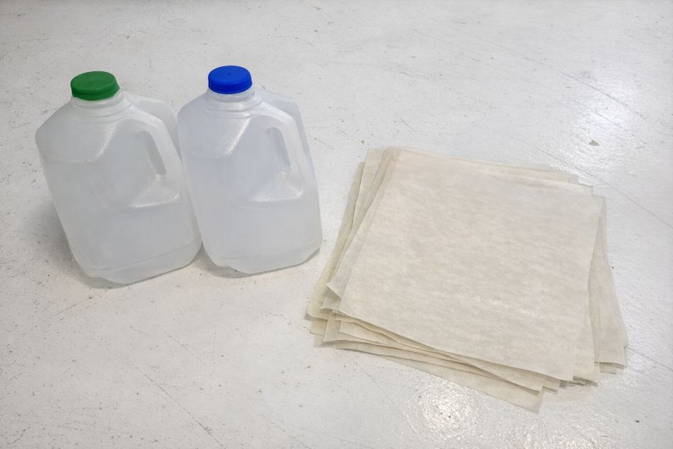 Cut the plastic milk jugs into flat panels, removing the handles and bottom.