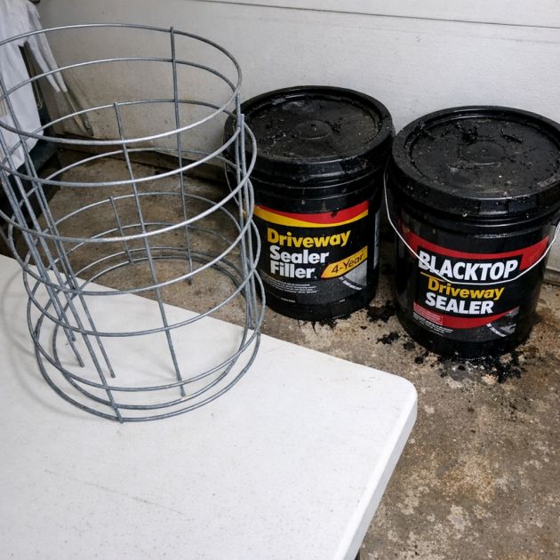 In the plastic bucket, pour a small amount of the thick black driveway sealant.