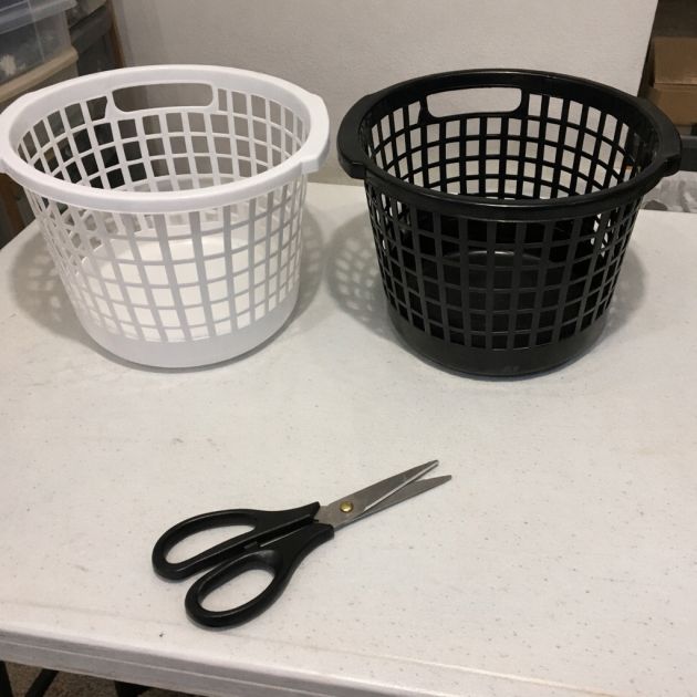 Cut the bottom off each laundry basket using scissors, leaving you with a cylindrical shape.