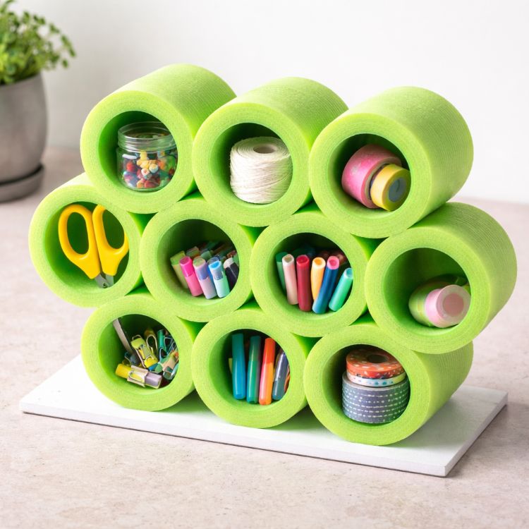 This pool noodle storage rack can be styled with vibrant colors to add a playful touch to a child's room, a craft area, or even a home office. By choosing pool noodles in colors that complement your existing decor, you can seamlessly integrate this storage solution into your home. Consider using it to organize lightweight items like scarves, craft supplies, or even small toys.