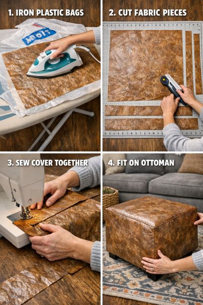 This DIY faux-leather ottoman cover is perfect for a modern or eclectic living room. The rich textures and unique patterns of the fused plastic create an eye-catching accent piece that complements neutral tones and natural materials like wood or metal. Pair it with a plush throw blanket and some contrasting cushions to complete the look. The ottoman can also serve as a statement piece in a minimalist setting, where its unique design can shine.