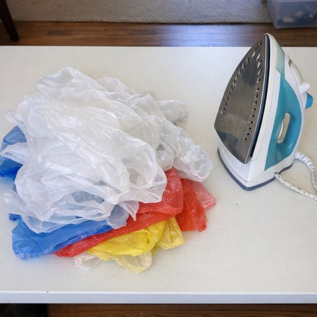 Layer 4-5 plastic sheets between two pieces of parchment paper. Make sure the parchment paper extends beyond the edges of the plastic to protect your iron and surface.