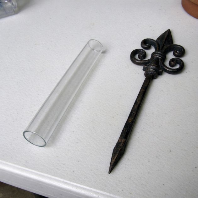 Select a decorative iron stake that is tall enough to hold the glass tube at a visible height and has a design that suits your aesthetic preferences.