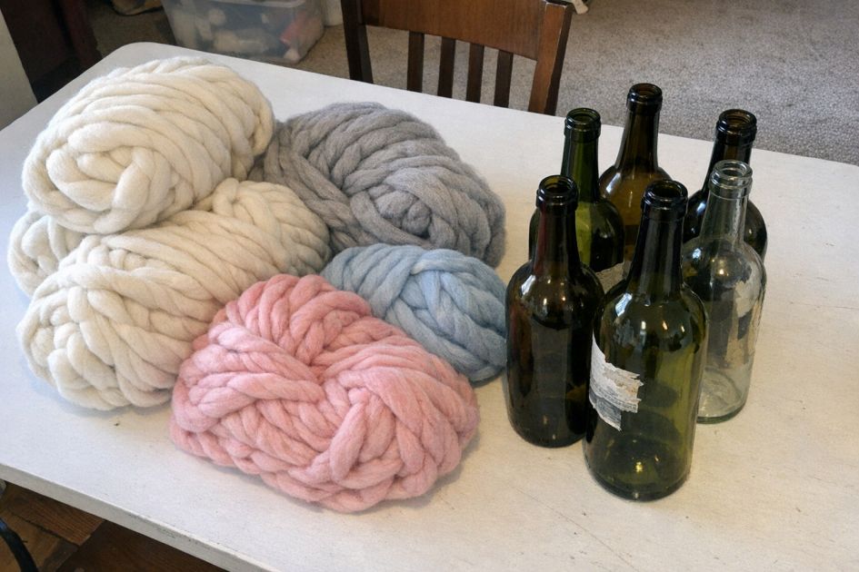 This DIY project transforms empty wine bottles into charming spring centerpieces by wrapping them in chunky blush pink yarn. Perfect for upcycling enthusiasts, this project combines the art of crochet with sustainable living, turning what might be discarded into a beautiful home decor piece. The soft texture and color of the yarn create an inviting and warm aesthetic, making these vases a delightful addition to any room.