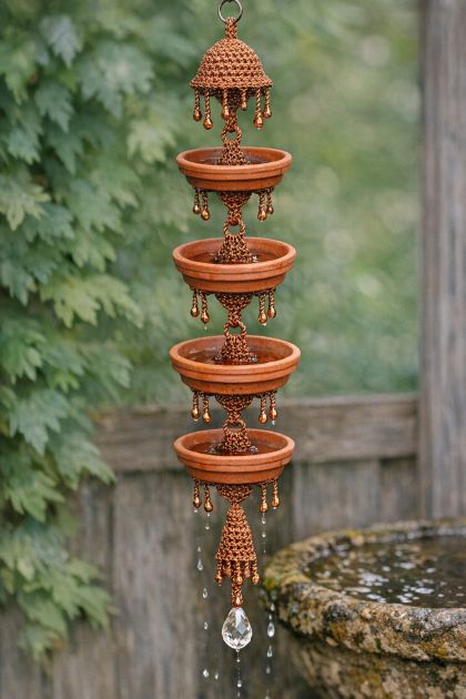 This DIY project is perfect for garden enthusiasts looking to add a unique decorative element to their outdoor space. By crocheting shiny metallic copper thread through terracotta plant pot saucers, you can create a stunning rain chain that not only serves a functional purpose but also enhances the aesthetic appeal of your garden. This project is ideal for anyone wanting to add a touch of rustic charm combined with a modern twist to their outdoor decor.