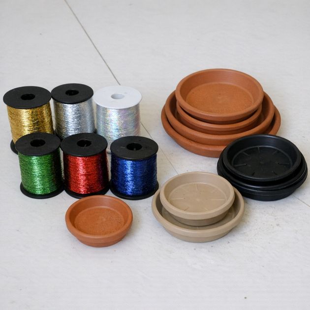 1. Begin by drilling a small hole in the center of each terracotta saucer. Ensure the hole is large enough for the crochet thread to pass through easily.
