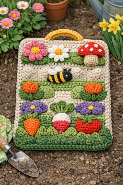 This DIY crochet garden kneeling pad can be styled to complement a rustic or farmhouse-themed garden setup. Consider using yarn colors that blend with your garden's natural hues, such as earthy greens, browns, or soft pastels. The pad can be hung on a hook near your gardening tools for easy access and aesthetic appeal. You can also display it as part of an outdoor seating arrangement, adding a cozy and personalized touch to your garden decor.