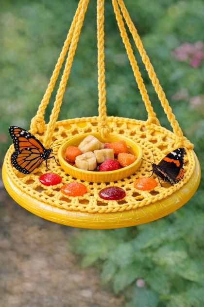 This unique DIY project combines the art of crochet with upcycling to create a delightful butterfly feeder. Butterflies are naturally attracted to bright colors, making this colorful and creative craft perfect for inviting these delicate creatures into your garden. By using an old frisbee, you not only breathe new life into a scratched toy, but you also contribute to a more sustainable environment. This project is a wonderful way to enjoy the beauty of nature right at home.