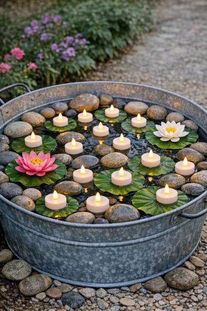 This DIY floating tea light pond is best styled in a cozy corner of your porch or garden. Pair it with comfortable outdoor seating and soft cushions in earthy tones to enhance the natural feel. Consider adding potted plants or hanging fairy lights around the area to complement the tranquil vibe. The combination of natural elements and soft lighting will create a harmonious and inviting space.