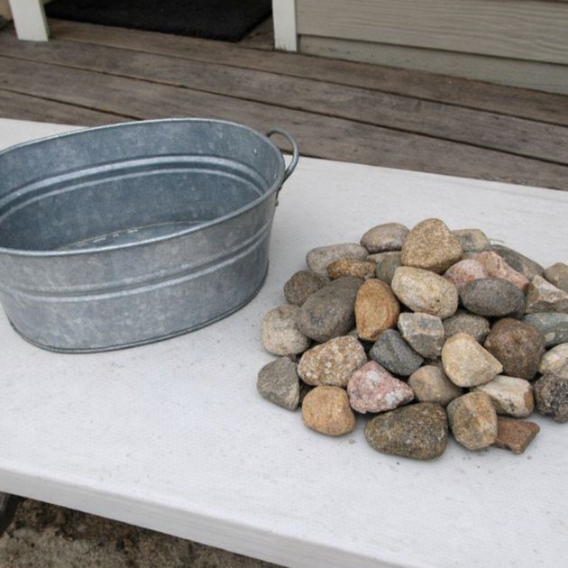 Arrange the smooth river rocks at the bottom of the tub, spreading them evenly.