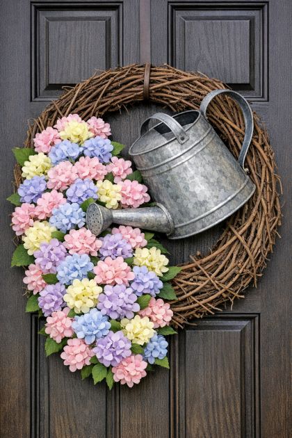 Creating a unique and eye-catching door wreath can add a personalized touch to your home decor. This DIY project involves mounting a galvanized tin watering can onto a grapevine wreath and embellishing it with pastel hydrangeas. It's a delightful way to blend rustic charm with floral elegance. Perfect for spring or summer, this DIY is both affordable and easy to craft, making it a viral sensation among creative home decorators.
