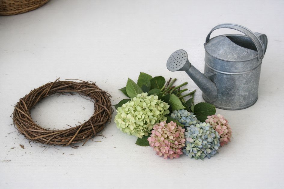 For added security, weave floral wire through the hydrangea stems and attach them to the wreath.